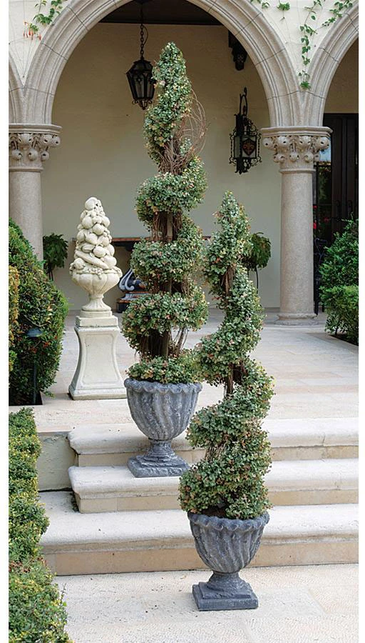 Dense, faux evergreen foliage fools the eye in these hand-crafted, everlasting topiaries that never need to be watered or pruned! Our “Spiral” topiary curves upward to a pleasant point. A Toscano exclusive in the traditional European style, our spiral topiary is set in an exquisite quality designer resin basin with a pitted stone finish. Your choice of sizes. Small: 11″dia.x48″H. 10 lbs.