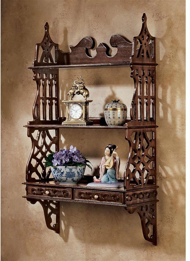 Add elegance to any room with the alluring design of this functional work of furniture art for your favorite collectibles. Flanked by open fretwork designs by English Cabinetmaker Thomas Chippendale, this triple shelf wall unit is hand carved of solid mahogany and finished with two drawers with ornamental brass pulls. 20″Wx7″Dx36″H. 13 lbs.
