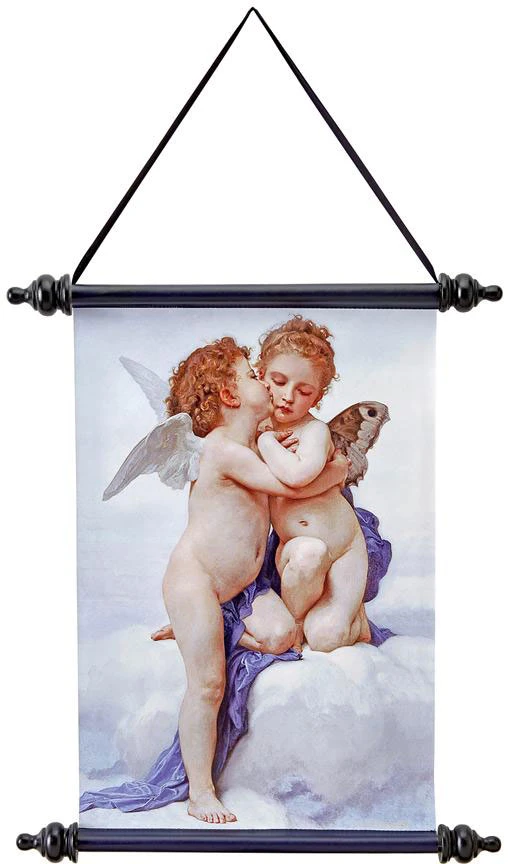 French artist Bouguereau’s celebrated cupid and fairy sitting on soft blue clouds are characteristic of the artist’s love of art as pure beauty. Our Basil Street Gallery vinyl-canvas wall scroll hearkens back to the parchments of European galleries. This beautiful work of decorative wall art is suspended from an ebony ribbon hanger by a black wooden rod and finials. 16″Wx1″Dx20″H. 1 lb.