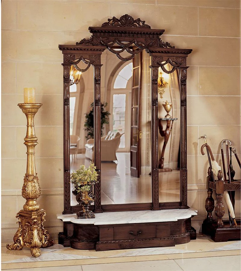 Don’t let the humble name “hall stand” fool you; with this renaissance revival masterpiece as a focal point, any entryway becomes a grande hall. At nearly seven-feet tall, with three separate mirrors, it features carvings that take a team of craftsmen over three weeks to create. Handsomely carved fluted columns, an acanthus leaf and shell motif, and dentil moldings under the pediment are complemented by delicate laurel swags. The base shelf is carved from variegated white solid marble and features a single drawer. So finely crafted, it’s hard to distinguish between an antique and our heirloom quality exclusive replica. 52″Wx18″Dx87″H. 200 lbs.