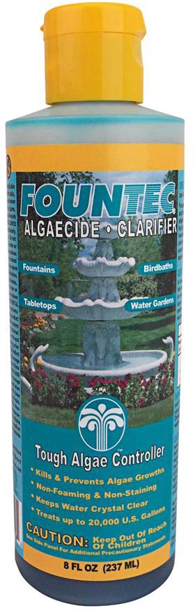 Eliminate algae and keep the water in your ponds and your Design Toscano fountains sparkling clean with this easy solution! Simply add a few drops from this generous 8 ounce bottle of concentrate to retain glistening clear water, keep your indoor and outdoor Toscano water features safe for plants, birds and wildlife (except fish), and eliminate mosquitos. For minimal maintenance without scrubbing, choose this easy addition to enjoy clean birdbaths and glistening water music throughout the seasons! Use as directed.8 oz. (237 ml.)