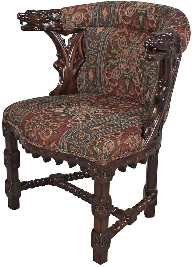 As impressive as any you’d find in an old English library, this replica, with deeply undercut dragon heads showcased by Gothic trefoil designs, requires a full week for our master carver to create! Hand upholstered front and back, in a quality custom designed heraldic griffin jacquard fabric, this comfortable chair glows in a rich, hand rubbed finish. This signature antique replica is a handsome Gothic-style work created exclusively for Toscano. Its style is a true investment in European beauty and stunning work of handcarved art. See additional views for upholstery color swatch. 25½”Wx20½”Dx33″H. 22 lbs.