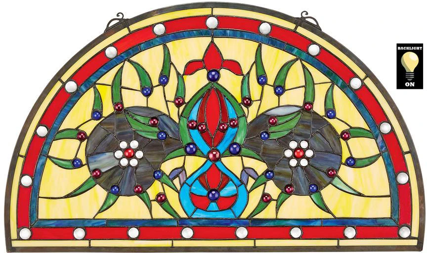 The elegance of a traditional half-moon shape blends with the sparkling beauty of vibrantly colored glass to create a Victorian-inspired window that tints the sunlight with texture and color. Each piece of art glass in this nearly 2½-foot-long work is hand-cut, copper-foiled and individually soldered, requiring three full days to complete. Scroll bracket and chain included for hanging. This is authentic hand-crafted art glass; variations of texture and color are part of the process. 27″Wx16″H. 6 lbs.