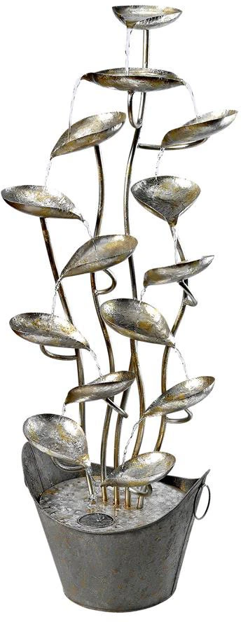 As sculpture, this all hand-crafted metal, bright silver garden water feature is unsurpassed! As a fountain it adds another dimension! At almost four-feet tall, the sculptural Rain Forest Leaves Cascading Metal Fountain will make enormous impact in the garden, on the deck or patio, or in an office reception lobby. Water works its way from the tallest stylized, raindrop-shaped leaf and cascades endlessly down multi-levels, touching all fourteen leaves, to the center where it constantly recycles from a hidden reservoir in the silver metal bucket base. Enjoy the sweet water music and harmony of one of the most beautiful fountains we have ever offered, our Design Toscano fountain can be placed indoors or out. This investment in fountain art features an integrated, UL-listed, indoor/outdoor pump. Bring inside during freezing temperatures. Simple assembly required. 16″Wx13″Dx46″H. 10 lbs.