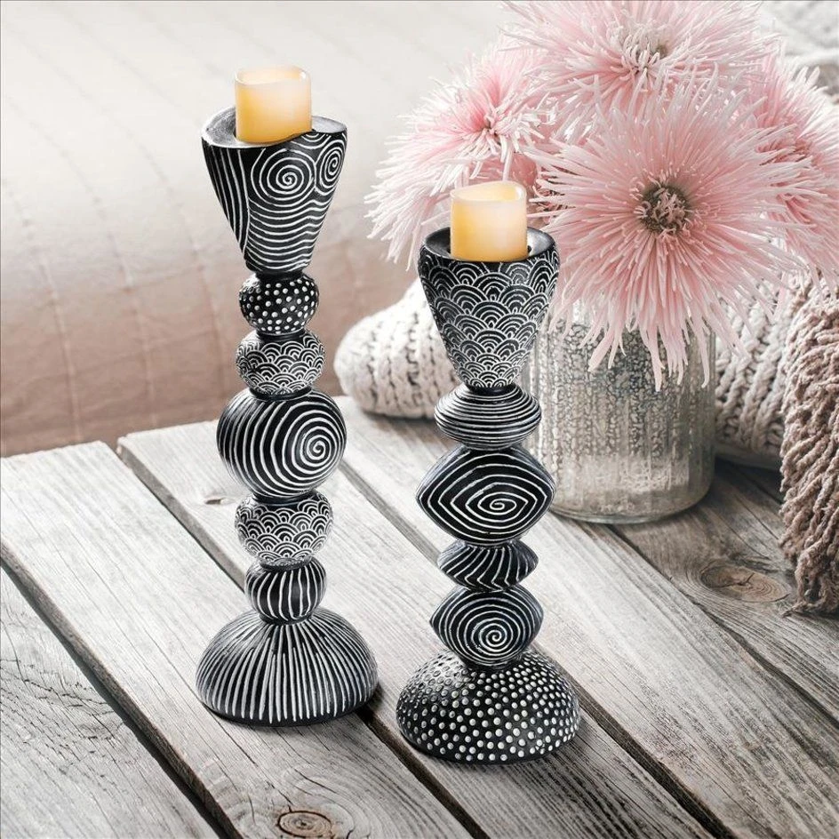 So exotic! Simultaneously modern and tribal, these contemporary candlesticks set a dramatic scene for a singularly sophisticated room. Ready to hold your 1″ dia. tapers, each geometric candlestick rises in a unique design with an aesthetically striking function. Cast in quality designer resin with a hand painted ebony and white finish, these strikingly versatile sculptures are a focal point with a mood all their own. Our modern masterpieces also make a unique gift! Set of Two: Each 3.5″dia.x10-12″H. 1 lb. Candles not included. Do not leave lit candles unattended.