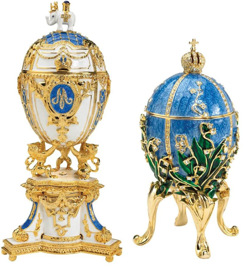 Ornate jeweler-style, museum-quality, enameled eggs like these were first made famous by the House of Romanov’s imperial jeweler in the 19th century. Empress Galina is an almost foot-tall beauty balancing an ornate, royal elephant, while Empress Valentina is topped with a tiny crown. Both are cast in pewter using the ancient lost wax method before the brilliant white, blue and green enamel, faux jewels, and tiny embellishments are added. Both open to hold your tiny treasures! Valentina: 3½”dia.x6″H. 2 lbs. Galina: 4½”dia.x9½”H. 4 lbs.