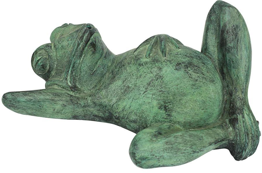 Our lazy bronze frog statue is a charming year-round reminder of “fun in the sun” for any pond, fountain or garden. Our spitting frog bronze statue boasts a hand-applied emerald verde bronze patina. Cast and crafted one piece at a time in the traditional lost wax method which guarantees lasting beauty. Sure to be a focal point, this Design Toscano heirloom-quality bronze garden statue conveys that you take the exterior of your home as seriously as the interior. Piped to optionally cascade flowing water from the frogs mouth into your pond or fountain. Simply add the optional 120 or 290 GPH (depending on your water height preference) pond pump kit to create beautiful water music in your garden. Makes a fanciful addition to your favorite pond, fountain or flowerbed! Accommodates Toscano Pump Kit DR-120 or DR-290, sold separately. 9″Wx12″Dx5½”H. 7 lbs.