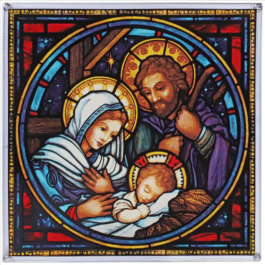A classic New Testament image, our sacred religious art features the Christian saints Mary, Jesus and Joseph, is a reminder of the sanctity of the family. Each window is rendered with blessed reverence and details including holy crowns, Star of Bethlehem, and a devotional spirit of the nativity story. This art glass, also called stained glass, is created by a unique technique of fusing hand-rolled architectural glass with unique transparent enamels, then kiln fired at temperatures above 1100 degrees Fahrenheit so the colors actually become part of the glass. The shades and hues will stay bright and glowing with radiant color and provide a stunning view from either side. Our Design Toscano art glass window is framed in zinc with a hanging chain for window display and a tabletop easel stand to enjoy this treasured piece in any room. 7″Wx7″H. 0.5 lb.