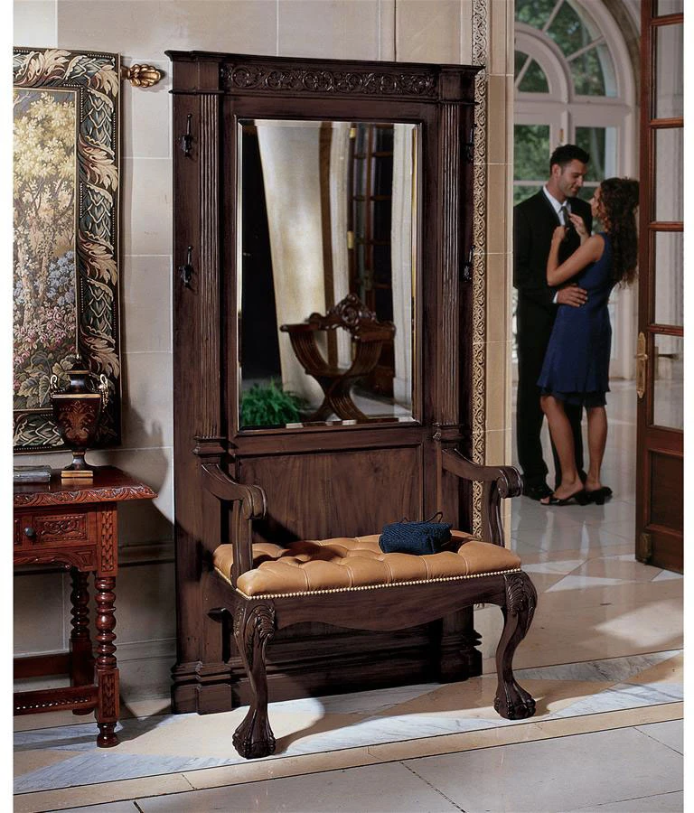 An essential furnishing for the well-appointed foyer! From the decorative carvings on the pediment to the stylish ball and claw feet, this substantial foyer stand is as beautiful as it is useful. It’s the perfect arrival seat for guests or a comfortable spot while you are waiting for the car. The large beveled mirror allows you one last look before you leave the house, while the four brass hooks provide a place for your damp overcoat. Its tufted real leather seat is upholstered and hand tacked and accents the deeply carved solid mahogany. Simple assembly required. 44″Wx21½”Dx79½”H. 180 lbs.