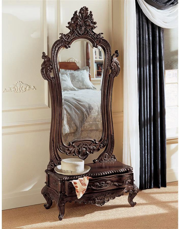 Taking over a week to handcarve the solid mahogany, your eyes will linger over the elegant curving acanthus leaves that frame this full-sized beveled mirror. Like those found in only the best Victorian homes, it tilts with the turn of a small brass key so you can easily view your ensemble from shoe tip to top hat. A practical accessory drawer in the base makes this exclusive classic a truly functional decor piece. Simple assembly required. 32″Wx16″Dx74″H. 60 lbs.